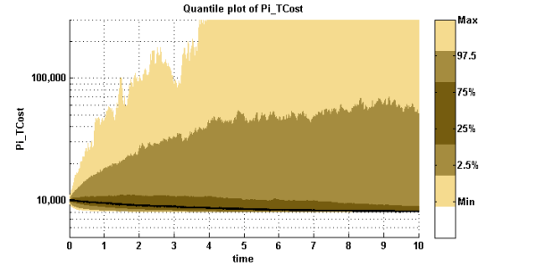 We can see that without transaction costs, there is a 2.5% chance of making EUR 100,000  and more from the initial EUR 10,000 portfolio. But, about 50% of the portfolios lose the whole stock exposure and fall on the EUR 8,000 guarantee level (Bond Floor).