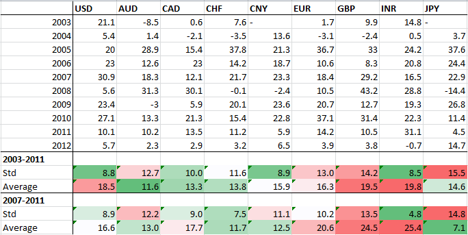 Now, we interpret the table – green means: “currency and gold are similar”, red means: “currency and gold are different”. Using this interpretations, we can see that CAD is more green than USD in 2003-2011 and CHF is more green than USD in 2007-2011. In both periods, USD is among the most stable currencies. But, this growths is pretty large – is this a sign of a stable currency? An average return of more than 10% p.a. in 2003-2011 seems too large.