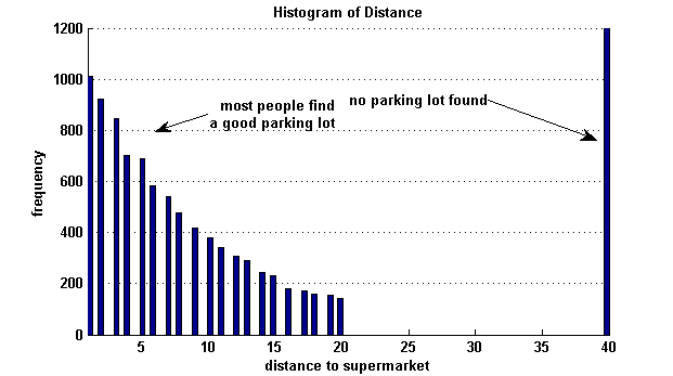 This example uses 10,000 Monte Carlo simulations for finding a parking spot. Since in this example, there is only a 10% chance that each spot is empty, we often find a very bad spot (e.g. more than 1,000 of 10,000 park at a distance of 20) and sometimes we find no spot at all (about 1.200 written as distance 40). Less than 200 find the best spot with distance 1.